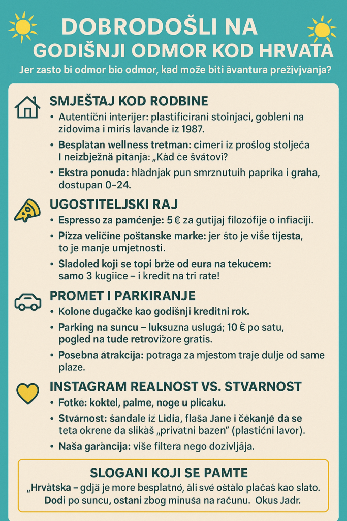 No, zato je Instagram pun božanstvenih scena: sunce, koktel (posuđen od prijatelja samo za fotku), noge u plićaku, a iza kamere – sandale iz Lidla i pola litre Jane. Stvarnost? Pet sati u koloni, parking skuplji od mjesečne rate kredita, i smještaj kod tete koja ti je ustupila sobu punu goblena i plastificiranih stolnjaka.