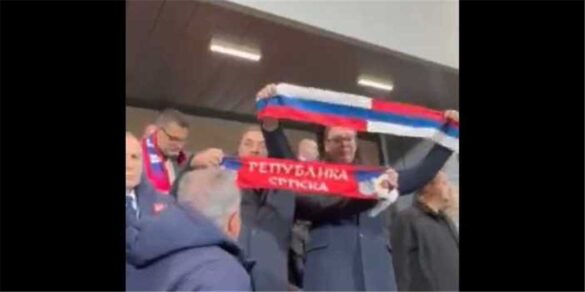 Utakmica 3. kola Lige nacija igrala se u subotu na stadionu u Leskovcu, a na tribinama su između ostalog bili Vučić te Milorad Dodik, šef Republike Srpske. Upravo je Dodik na X-u podijelio snimku na kojoj se vidi kako je Vučić burnim pljeskom pozdravio izvođenje srpske himne Bože pravde te zatim iz džepa izvadio šal i raširio ga.