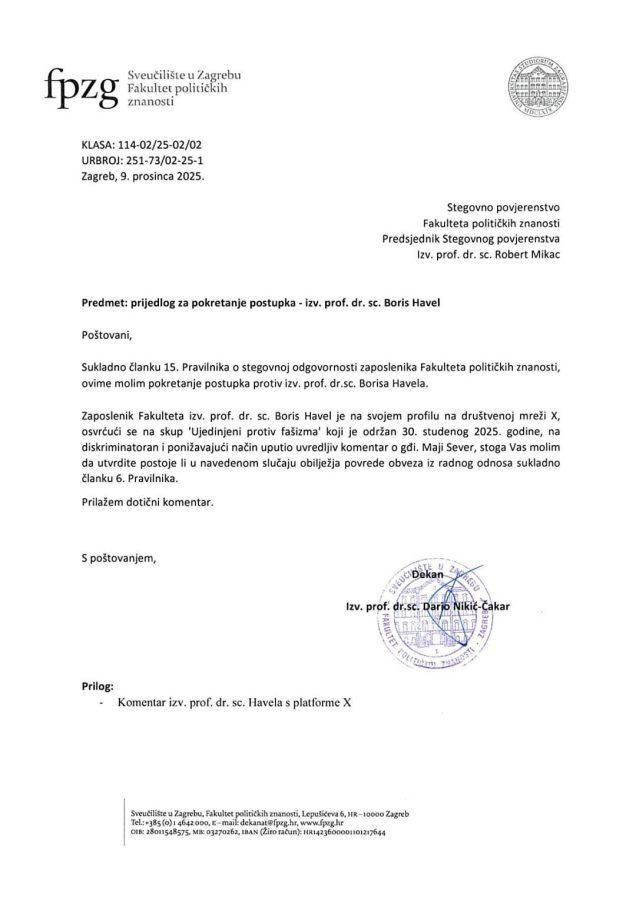 Ustav Republike Hrvatske jamči građanima pravo na slobodu mišljenja i izražavanja, a verbalni delikt je zakonom zabranjen. Međutim, recentni slučaj profesora Borisa Havel s Fakulteta političkih znanosti u Zagrebu, koji je zbog sarkastične objave na društvenim mrežama dobio opomenu pred otkaz, otvara niz pitanja o granicama slobode izražavanja i političkoj cenzuri u akademskom okruženju. Objavu koja je izazvala reakcije javnosti, komentirajući skup „Ujedinjeni protiv fašizma“ i novinarku Maju Sever, Havel je napisao u sarkastičnom tonu, no s obzirom na naknadne reakcije, čini se da se u akademskom okruženju ne primjenjuju ista pravila kada su u pitanju politički i ideološki stavovi.